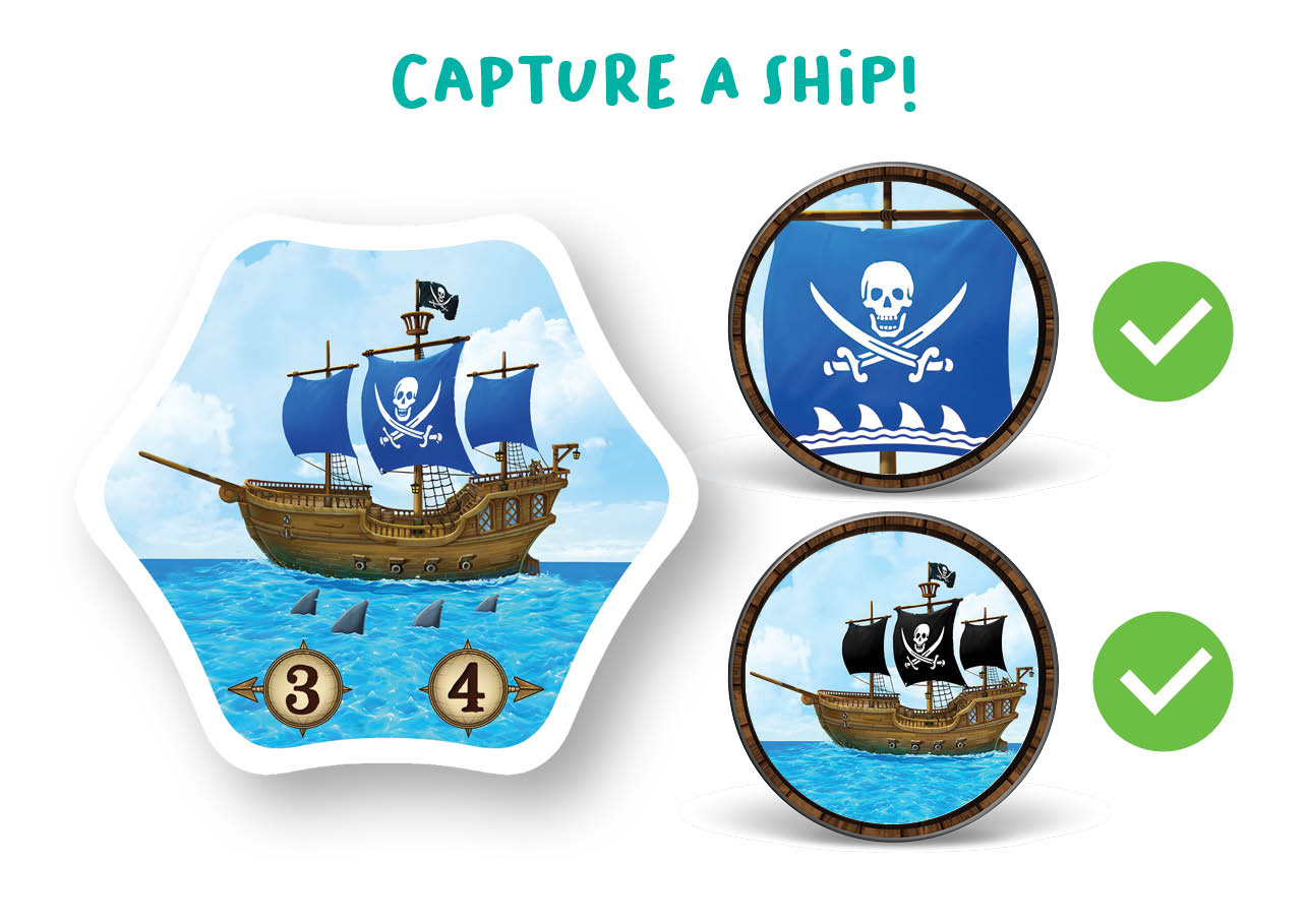 The first pirate to build an armada of 3 ships with the same colour of sails or the same number of sails, wins the game. ARRR!