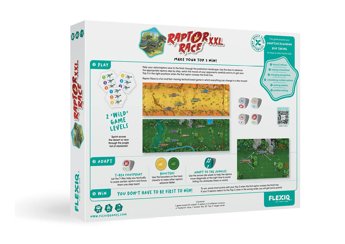 Raptor Race XXL est le premier jeu de société FlexiQ au format XXL pour toute la famille ! Marquerez-vous le plus de points avec vos 3 meilleurs raptors, même dans le mauvais ordre, après que le premier raptor a franchi la ligne d’arrivée ?
