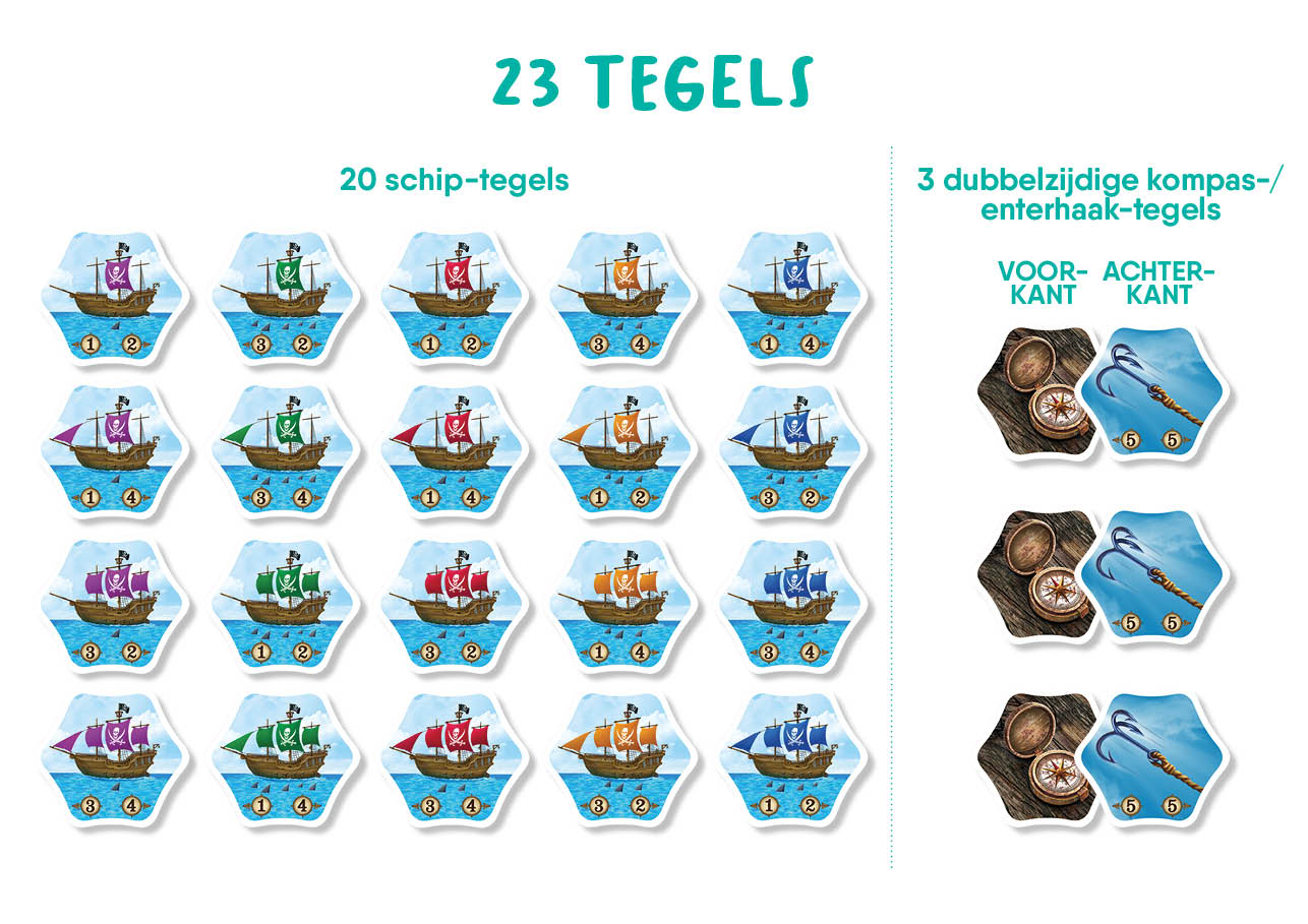 23 tegels (20 schip-tegels, 3 dubbelzijdige kompas-/enterhaak-tegels)